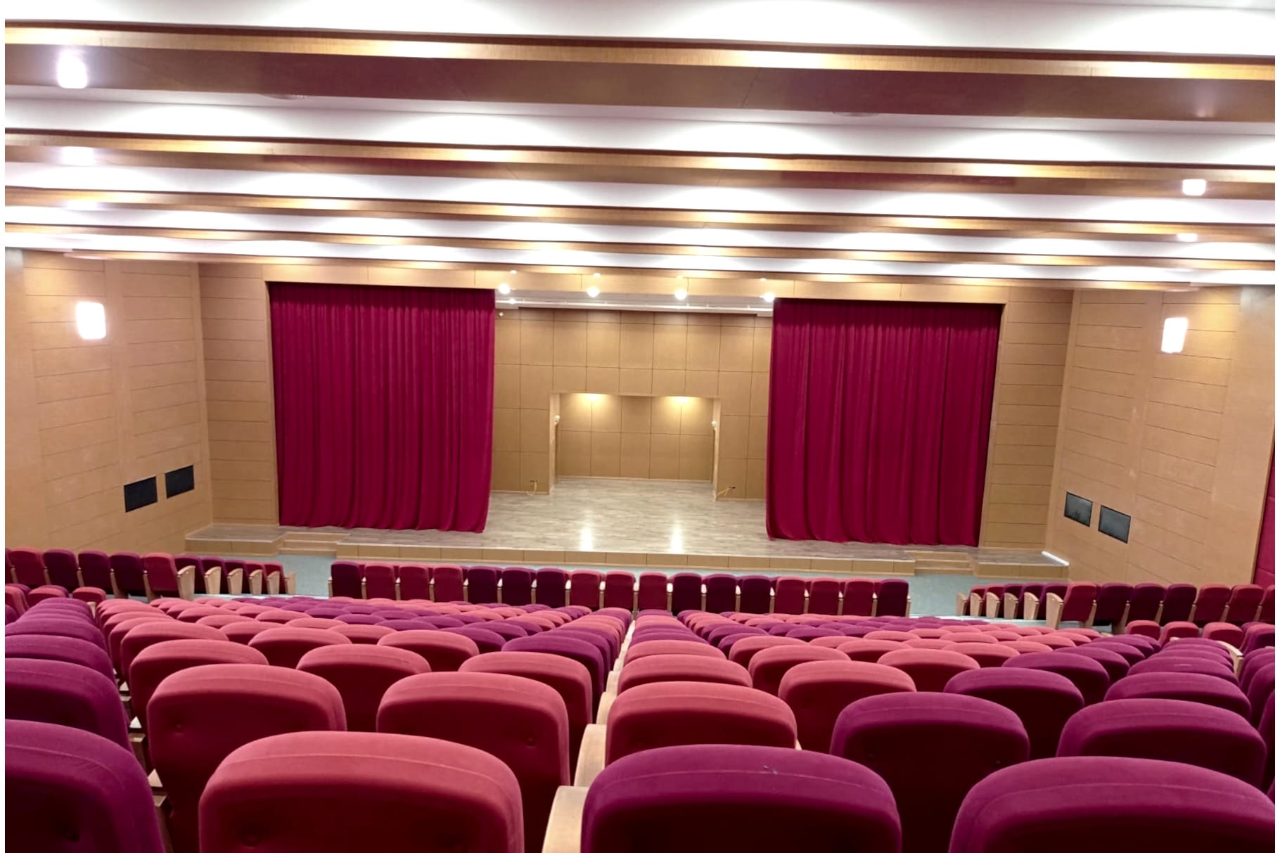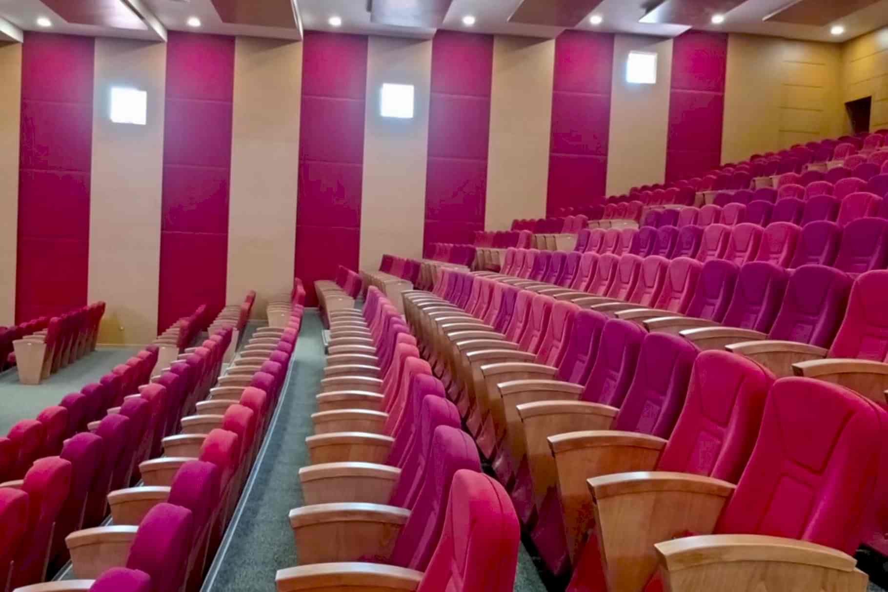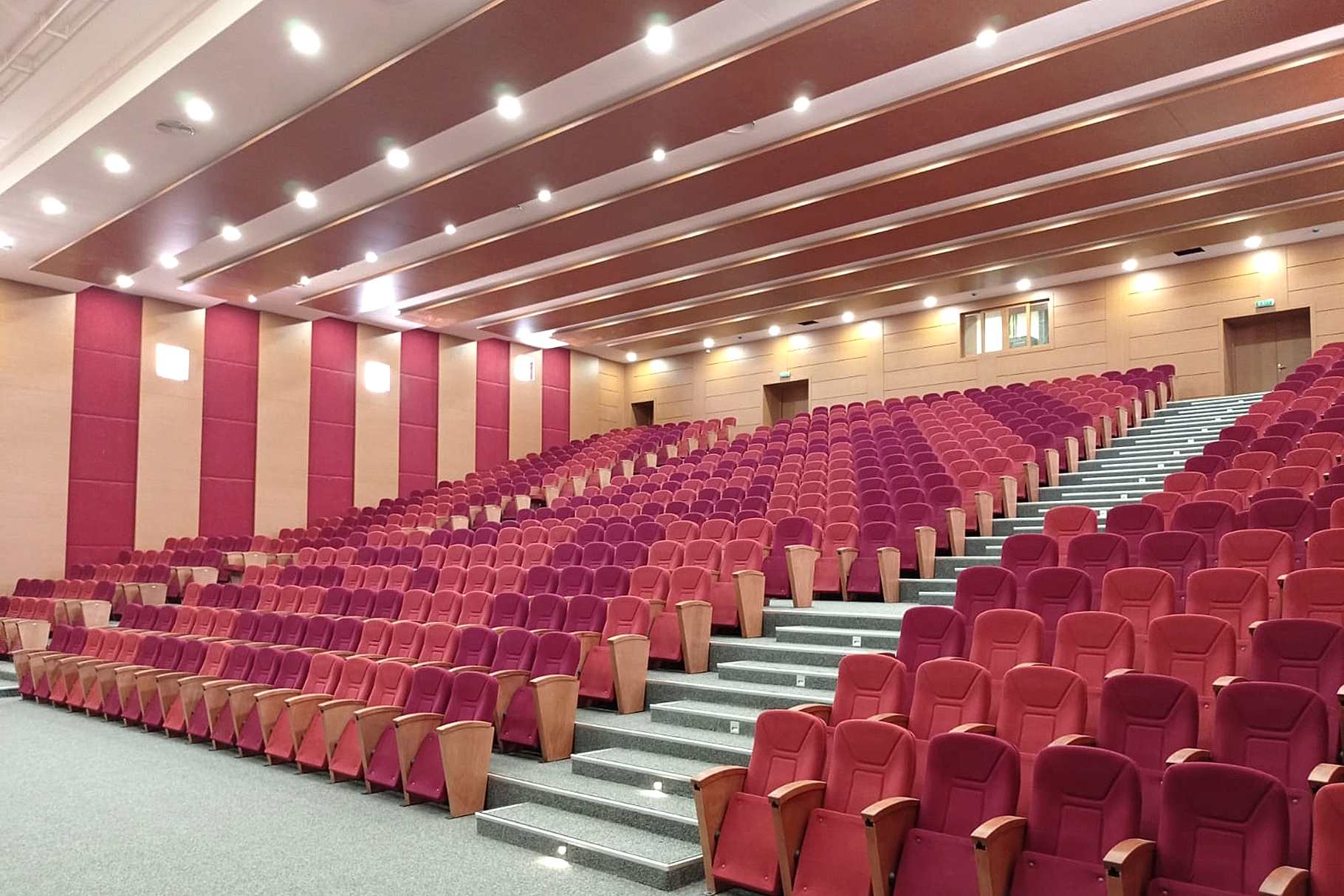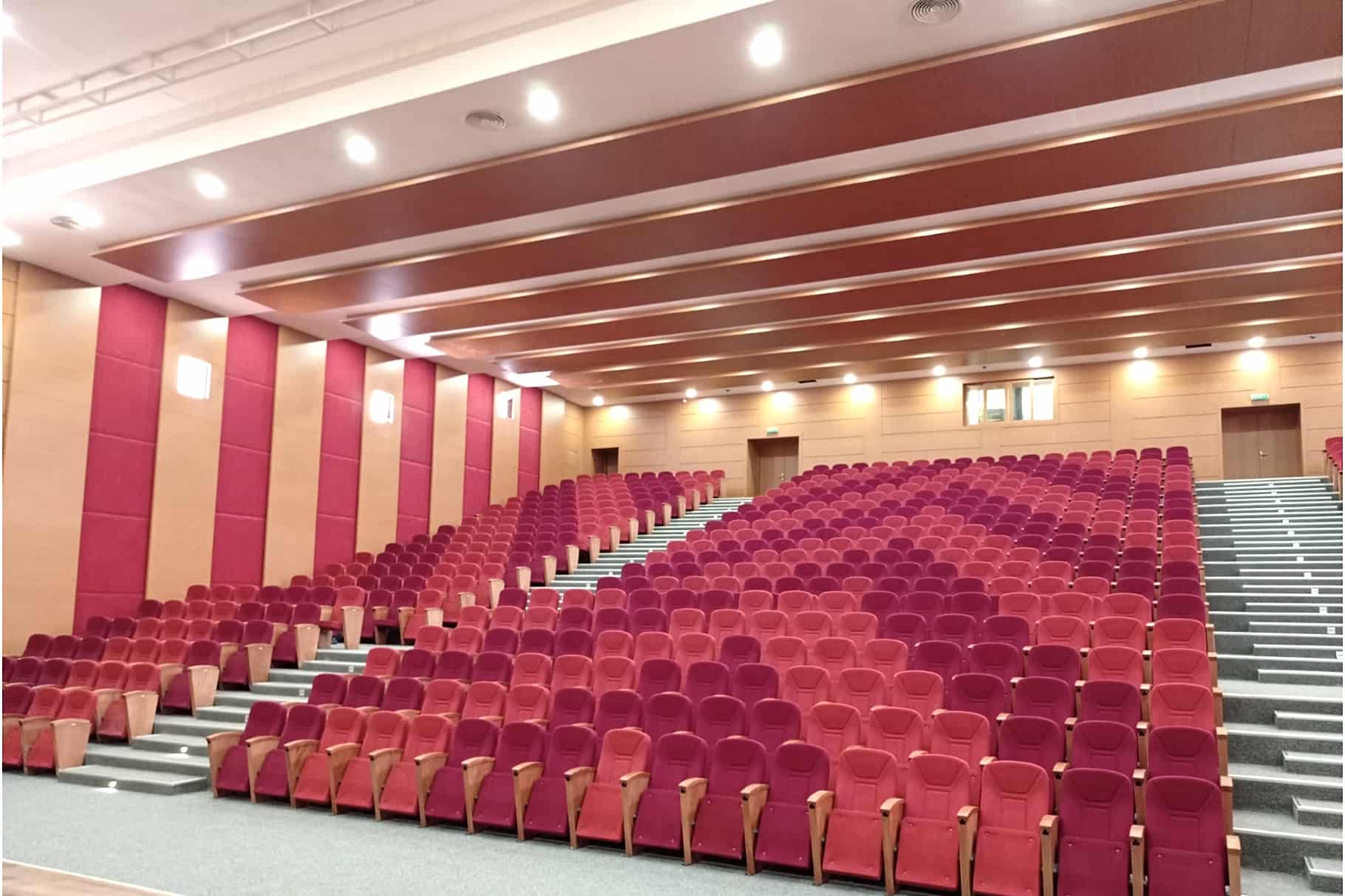 Yaklaşık 500 kişilik konferans ve çok amaçlı salonun akustik tasarım ve projelendirme çalışması firmamız bünyesinde yapılmıştır. Tüm inşai ve demir konstrüksiyon uygulamaları, ses izolasyonu, akustik ahşap paneller ve kumaş kaplamalı paneller, tüm ses izolasyonlu kapılar tarafımızca imal edilip monte edilmiştir. Proje dahilinde sahne perdeleri, koltuk, sahne parkesi ve süpürgelik uygulamaları yapılmıştır. Ahşap paneller için mdflam ahşap malzemeler, sahne parkesi için laminat parke kullanılmıştır.