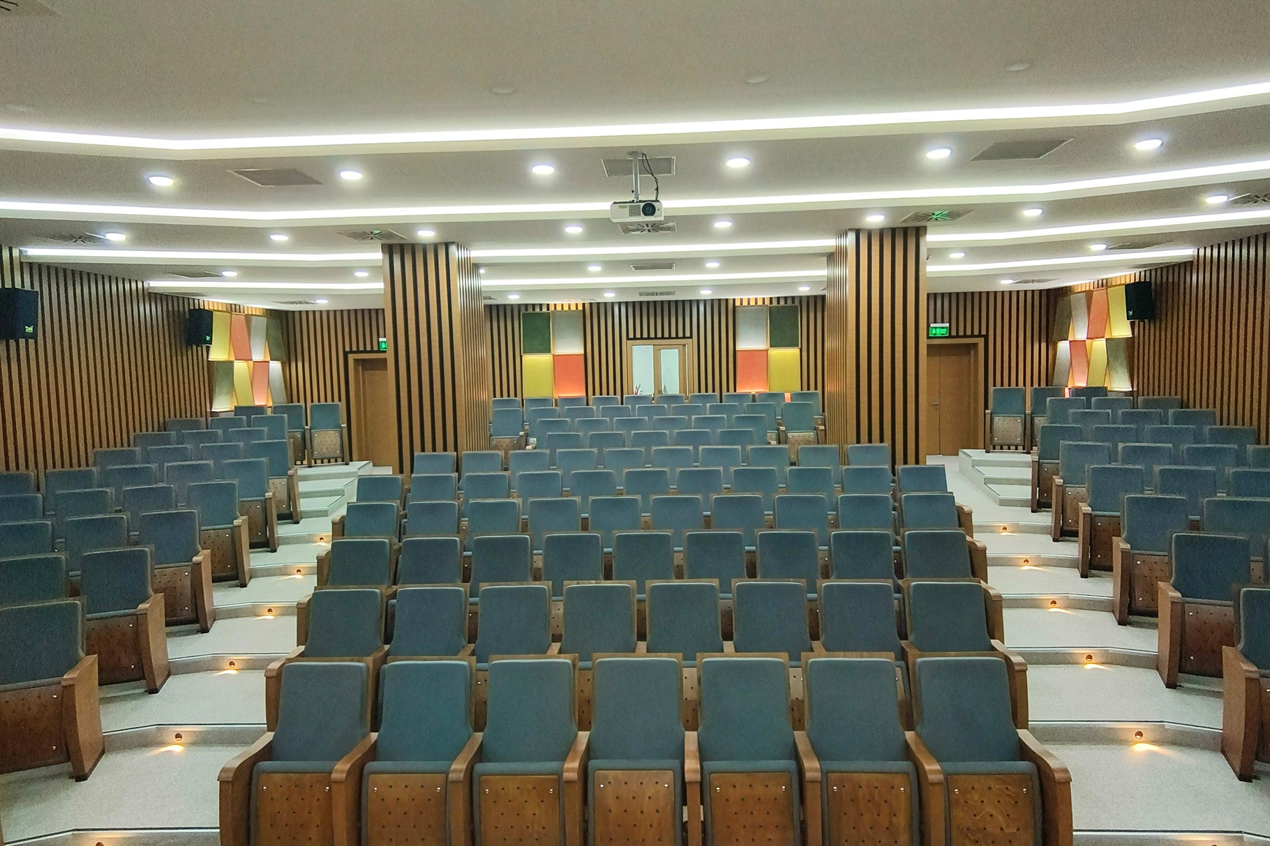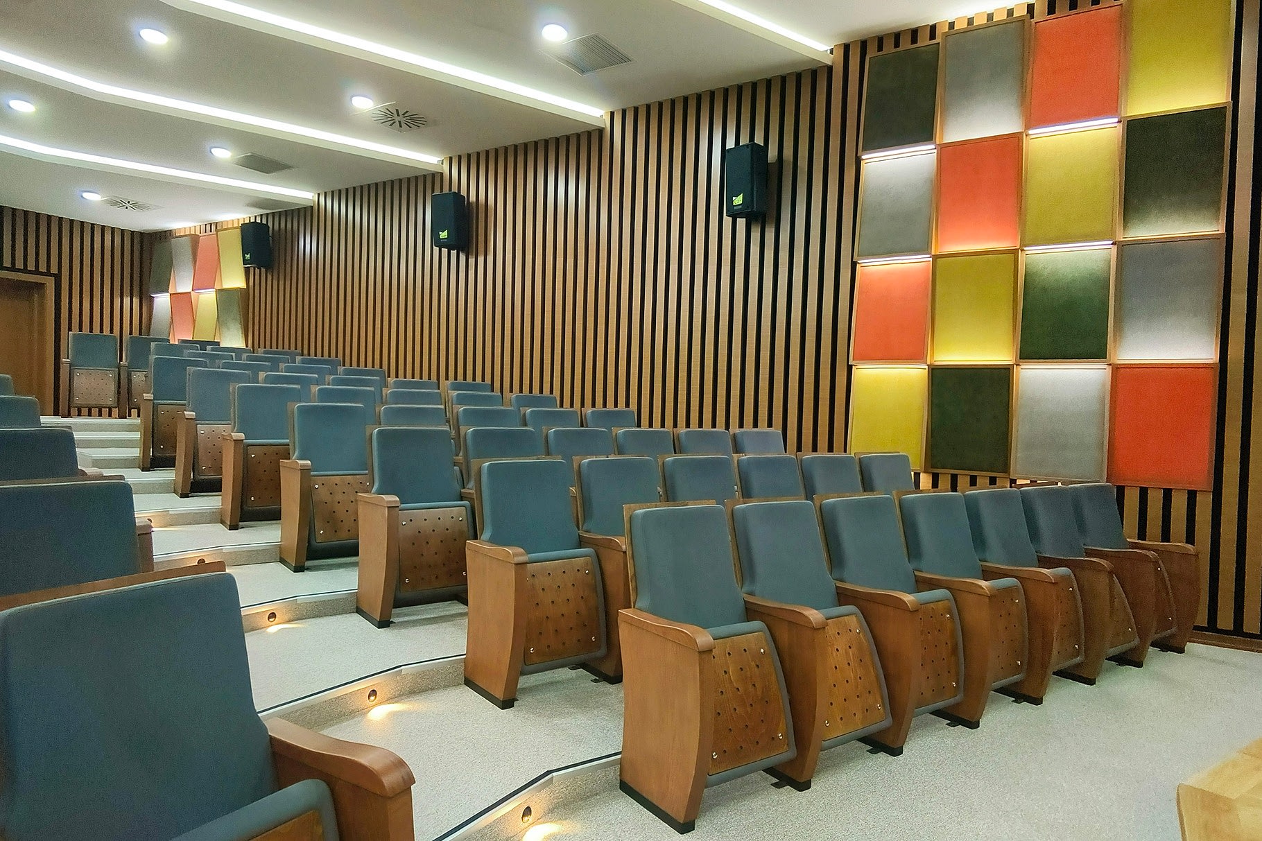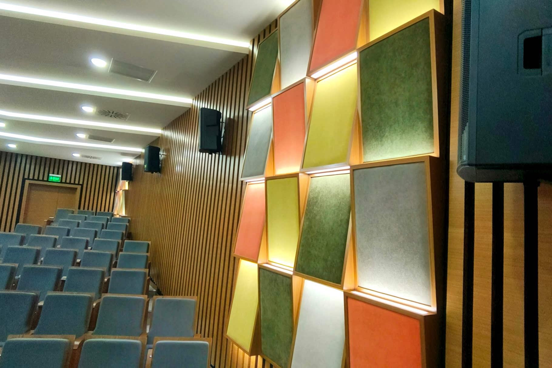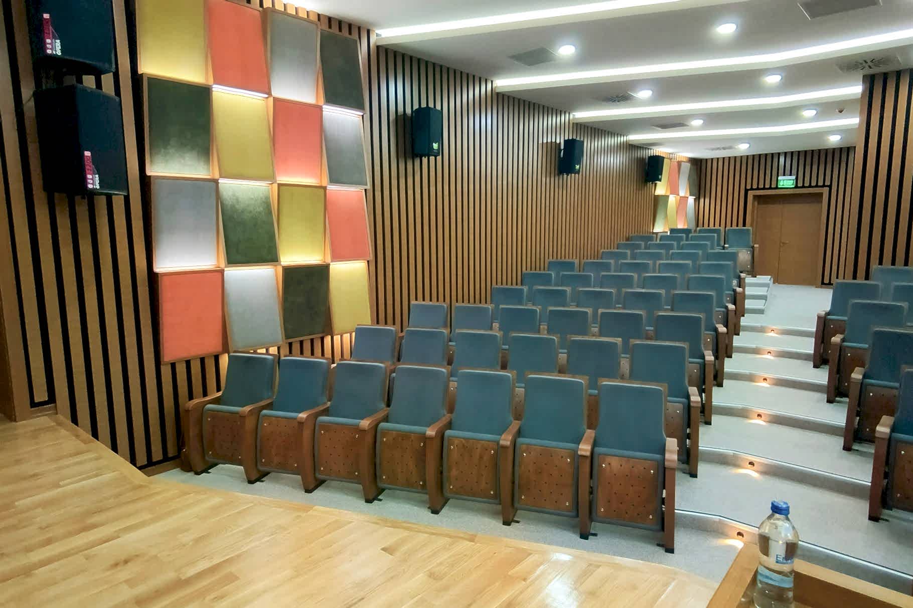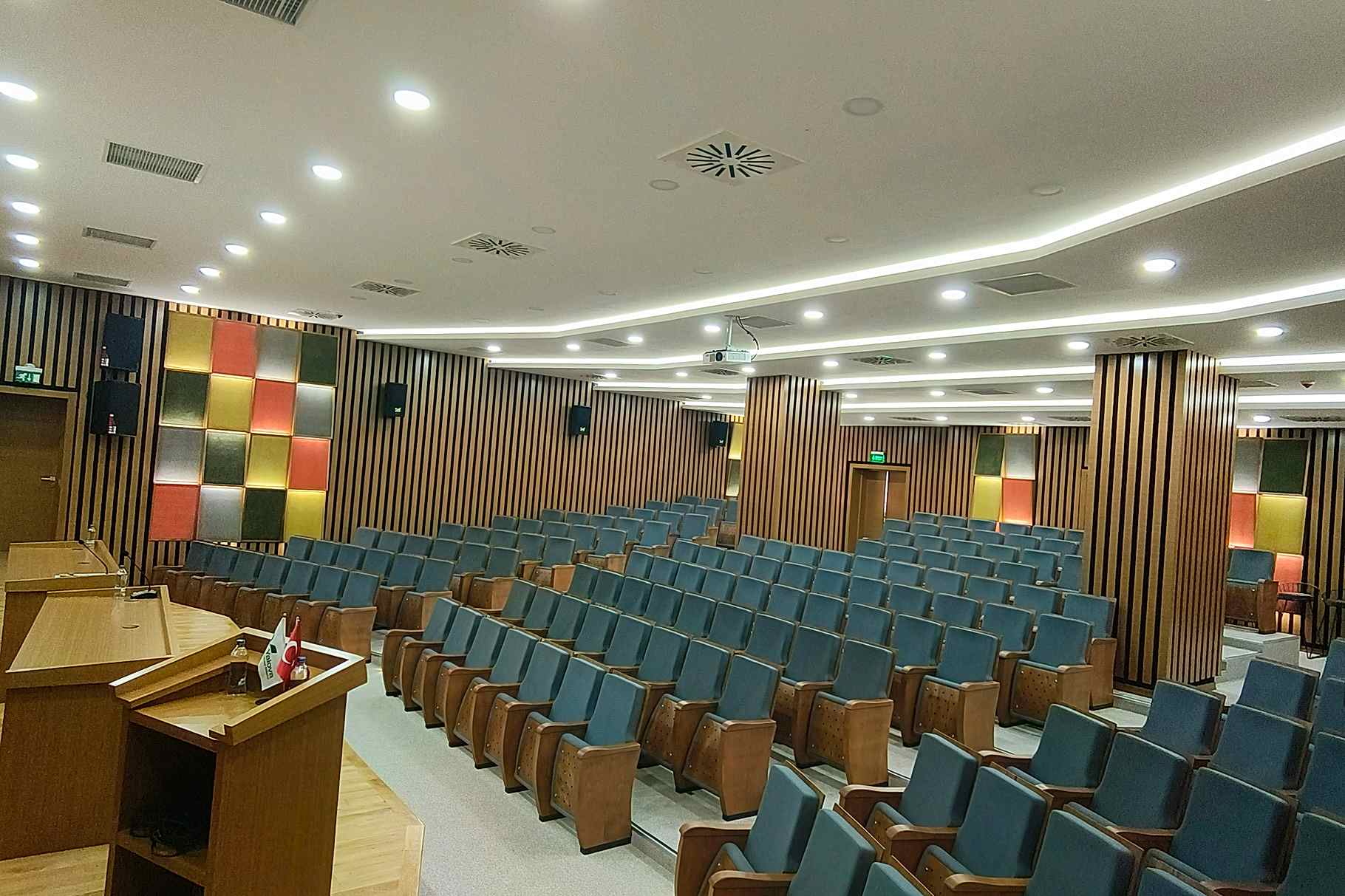Yaklaşık 180 kişilik konferans ve çok amaçlı salonun akustik tasarım ve projelendirme, ses yalıtımı, konstrüksiyon ve tüm inşai uygulamalar firmamız bünyesinde yapılmıştır. Akustik latalı ahşap paneller ve kumaş kaplamalı paneller, tüm ses izolasyonlu kapılar tarafımızca imal edilip monte edilmiştir. Proje dahilinde profesyonel elektronik ses, ışık ve görüntüleme sistemleri, elektrik alt ve üst yapı işleri, halı, koltuk, sahne parkesi ve süpürgelik uygulamaları yapılmıştır. Ahşap paneller için ahşap kaplamalı ve cilalı malzemeler, sahne parkesi için masif parke kullanılmıştır.