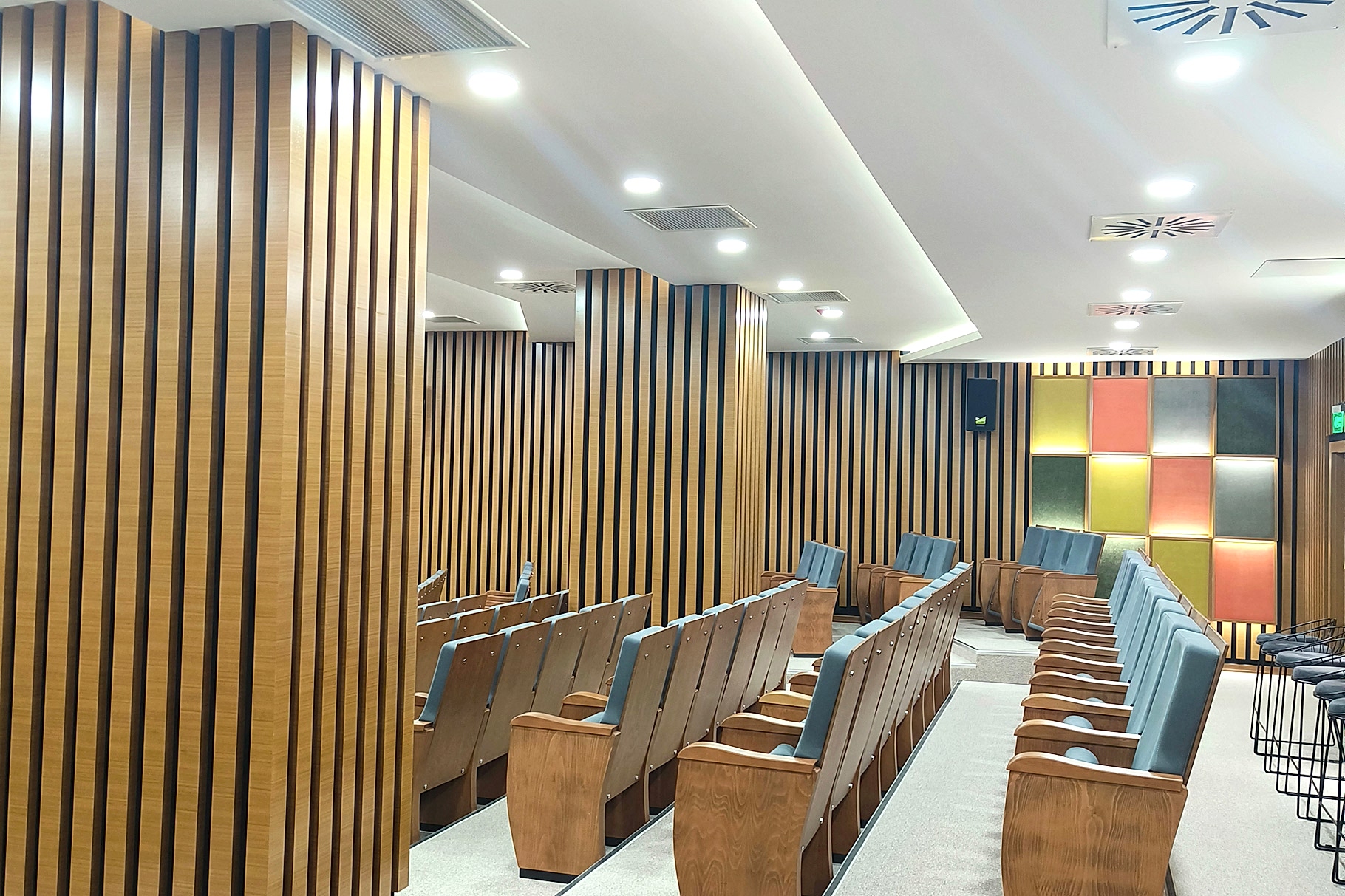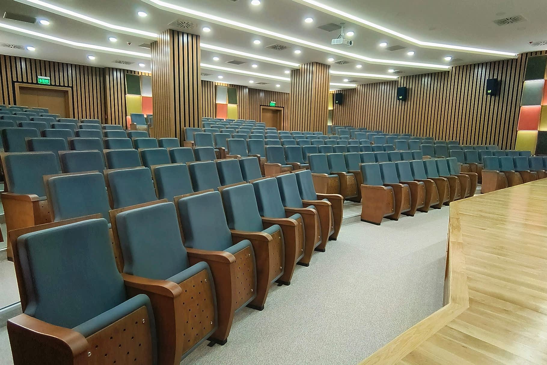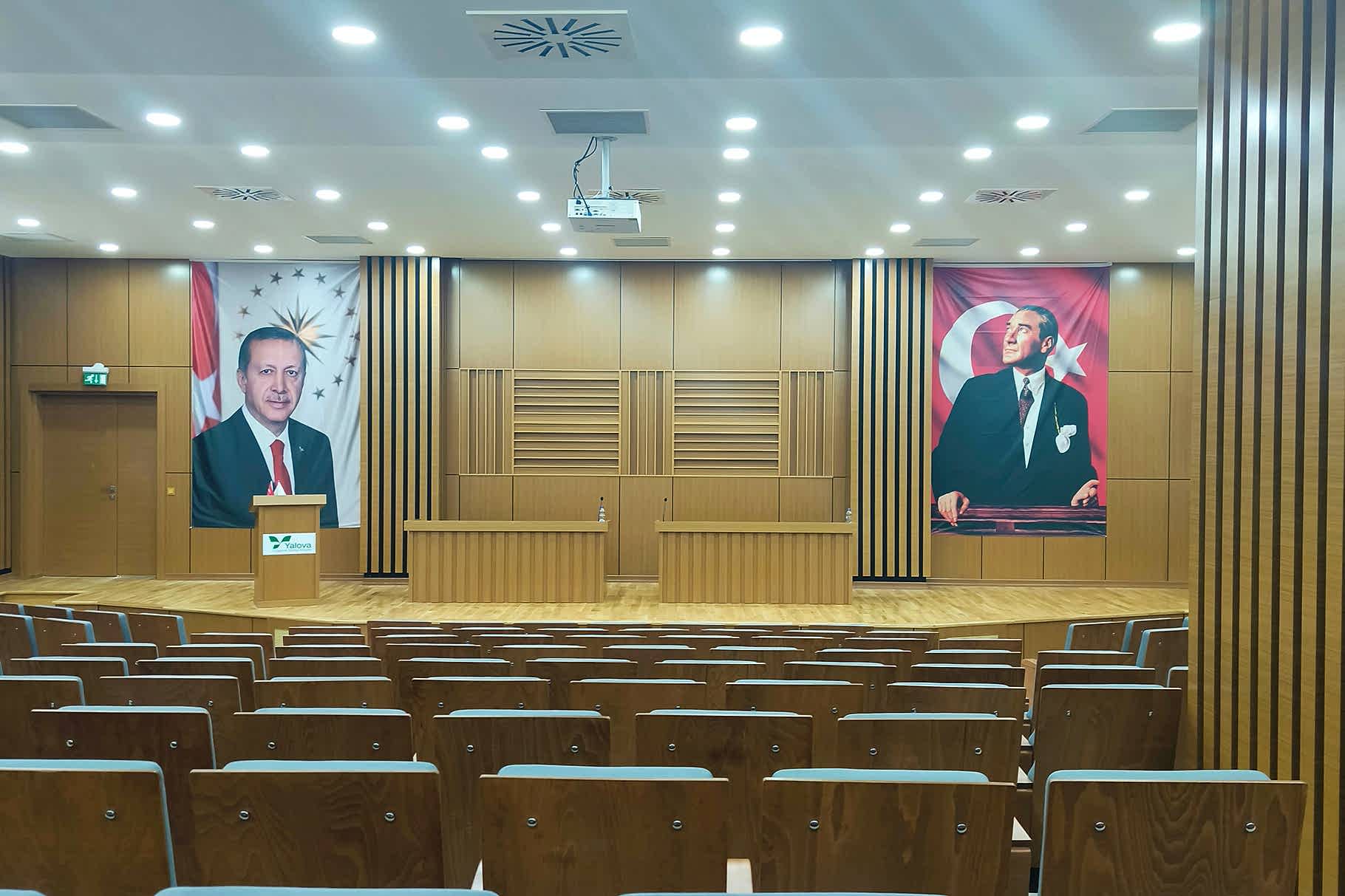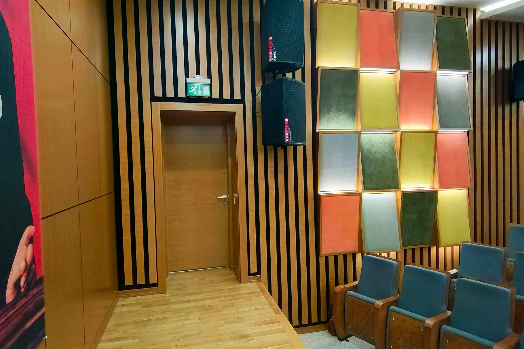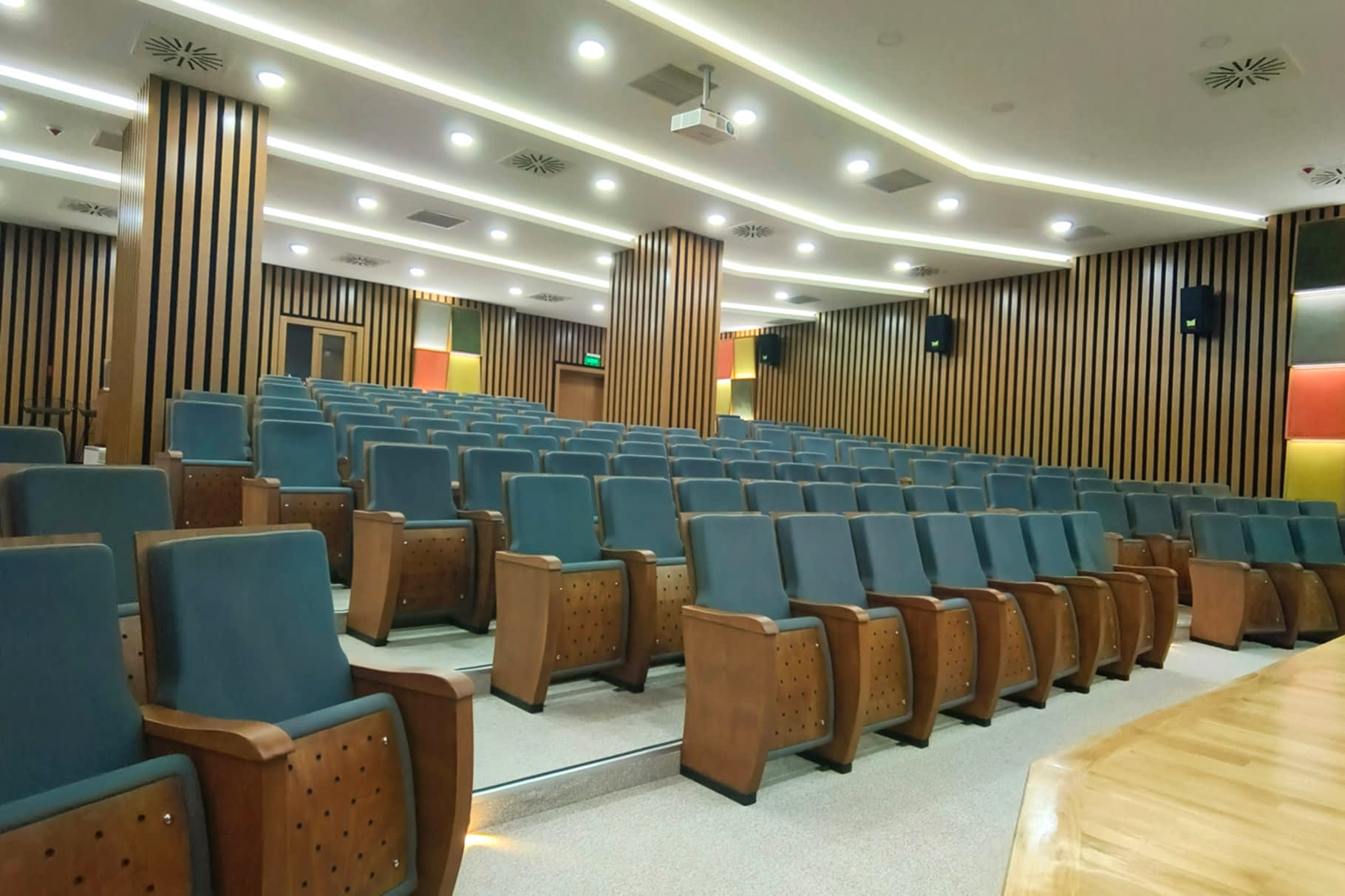 Yaklaşık 180 kişilik konferans ve çok amaçlı salonun akustik tasarım ve projelendirme, ses yalıtımı, konstrüksiyon ve tüm inşai uygulamalar firmamız bünyesinde yapılmıştır. Akustik latalı ahşap paneller ve kumaş kaplamalı paneller, tüm ses izolasyonlu kapılar tarafımızca imal edilip monte edilmiştir. Proje dahilinde profesyonel elektronik ses, ışık ve görüntüleme sistemleri, elektrik alt ve üst yapı işleri, halı, koltuk, sahne parkesi ve süpürgelik uygulamaları yapılmıştır. Ahşap paneller için ahşap kaplamalı ve cilalı malzemeler, sahne parkesi için masif parke kullanılmıştır.